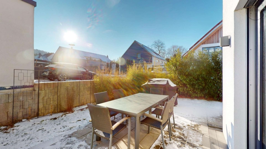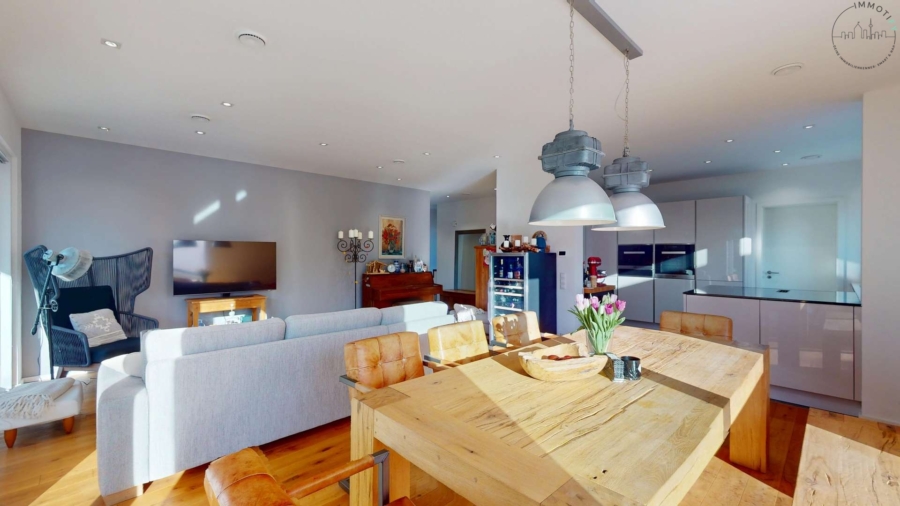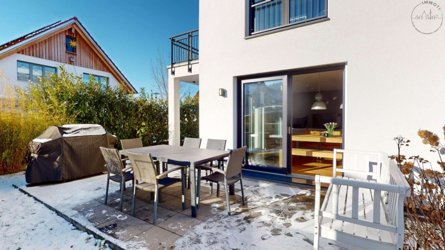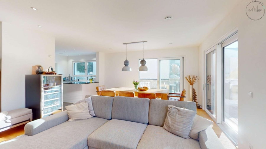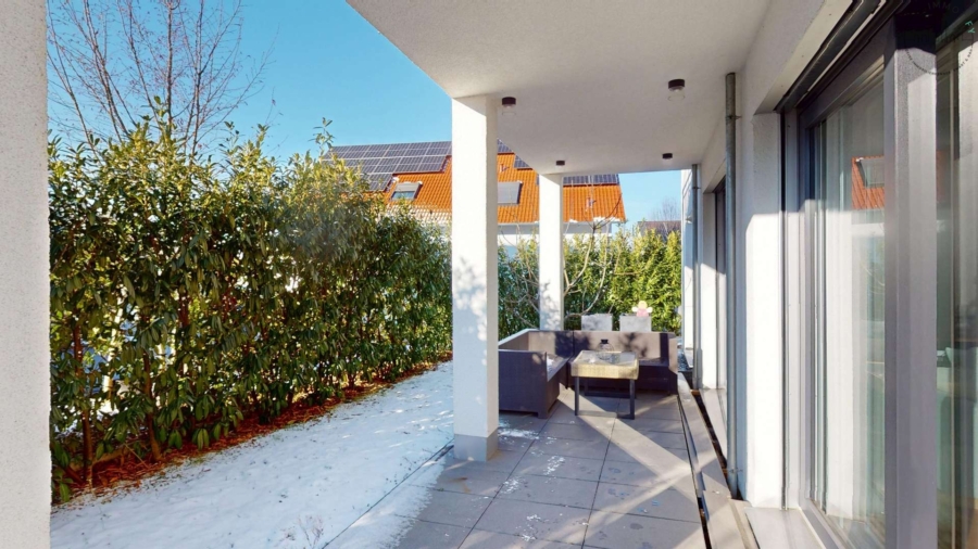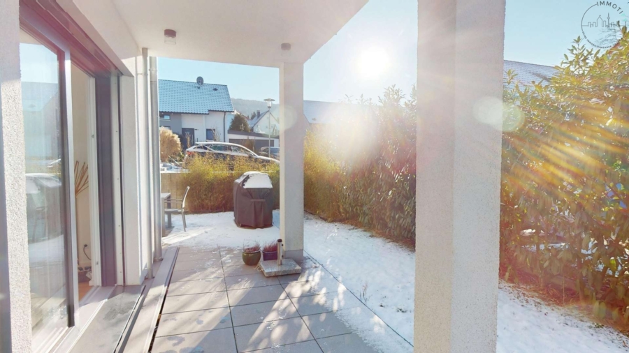 Von Wohn- und Essbereich aus gelangt man auf die teilweise überdachte Terrasse mit ca. 37 m², die den Wohnraum in den wärmeren Monaten spürbar erweitert.