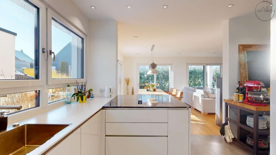 Die moderne Küche ist hochwertig ausgestattet und fügt sich perfekt in das offene Wohnkonzept ein – ideal für gemeinsames Kochen, Leben und Genießen. Ergänzt wird das Erdgeschoss durch ein Gästezimmer bzw. Büro, ein Gäste-Duschbad, praktische Abstell- und Vorratsflächen unter der Treppe sowie den Technikraum.