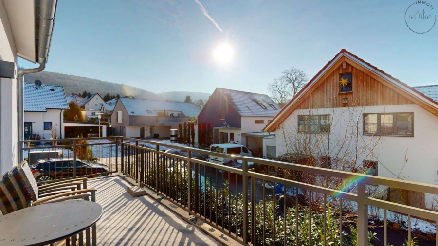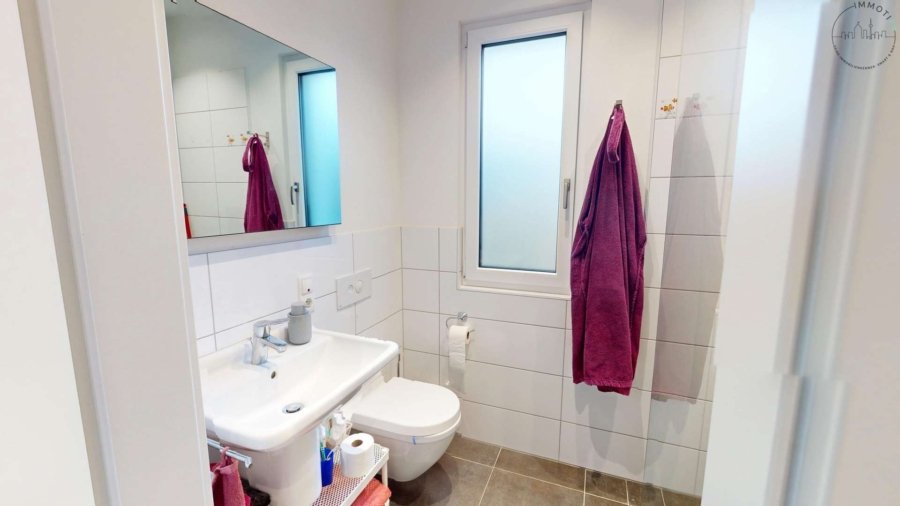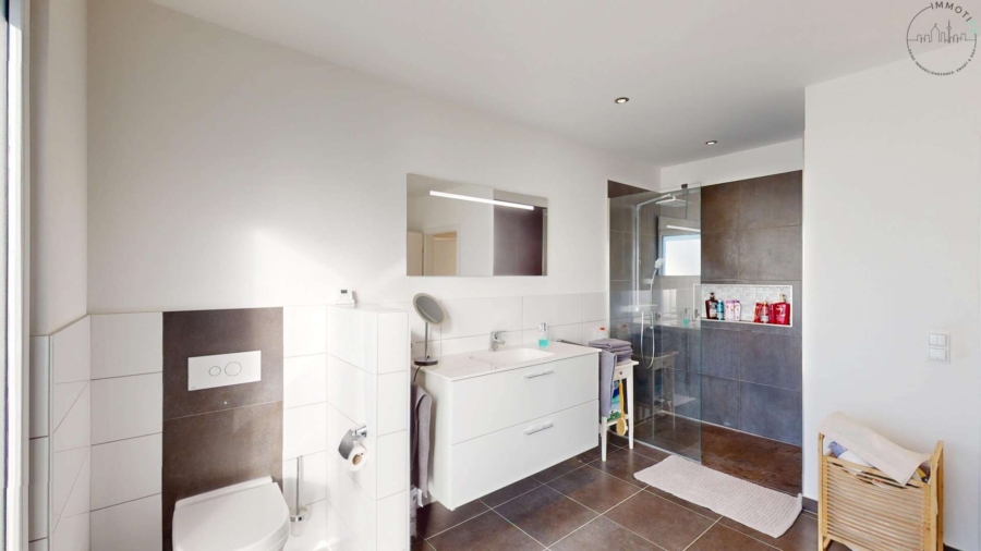 Das Hauptbadezimmer überzeugt mit ebenerdiger Dusche, tiefergelegter Badewanne, Fenster und hochwertiger Ausstattung. Vom Obergeschoss aus ist zudem der Balkon mit ca. 12 m² zugänglich.