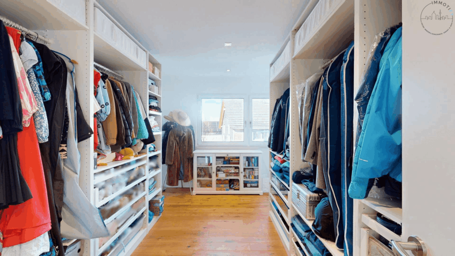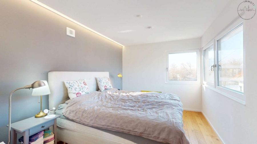 Im Obergeschoss befinden sich insgesamt drei Zimmer, darunter ein großzügiger Elternbereich mit separatem Ankleidezimmer. Die zwei weiteren Zimmer eignen sich ideal als Kinder-, Gäste- oder Arbeitszimmer.