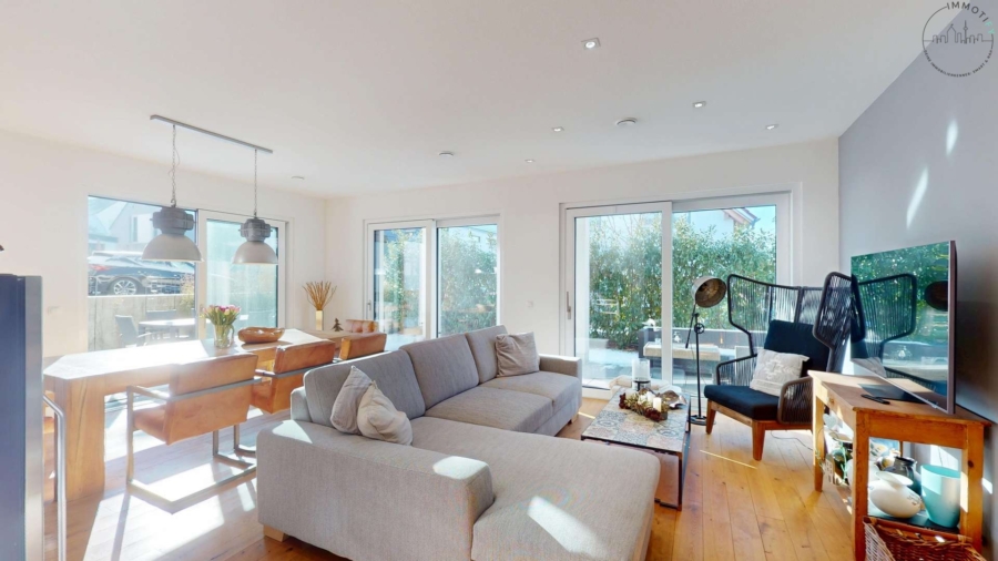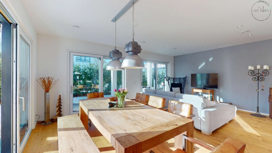 Bereits beim Betreten des Hauses wird der hochwertige Anspruch spürbar. Der zentrale Eingangsbereich führt in den großzügigen, offen gestalteten Wohn- und Essbereich mit fließendem Übergang zur Küche. Bodentiefe Fenster sowie drei großformatige Schiebetür-Elemente sorgen für viel Tageslicht und verbinden den Innenraum harmonisch mit den Terrassenflächen. Das Erdgeschoss wurde mittels Geschosserhöhung mit einer beeindruckenden Deckenhöhe ausgeführt.