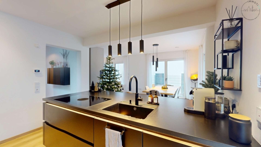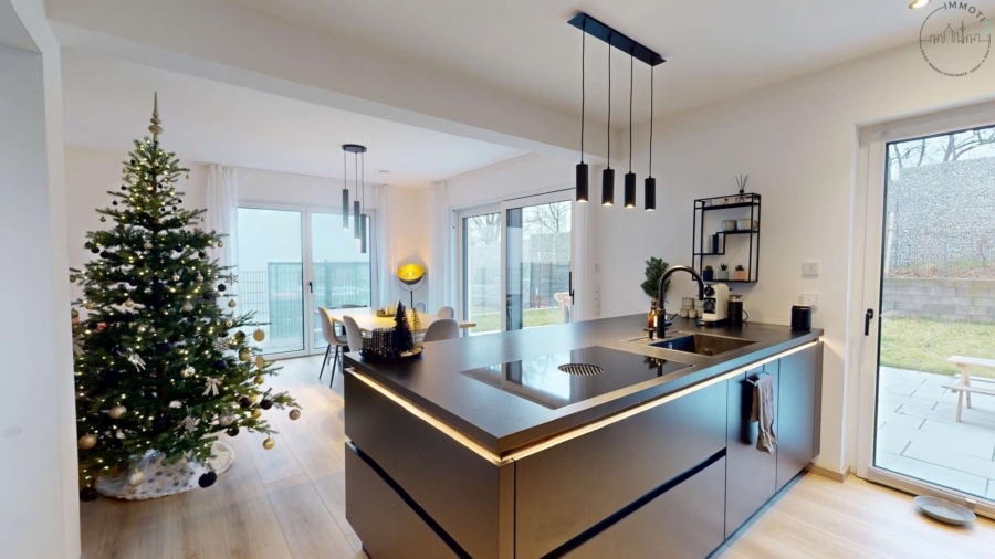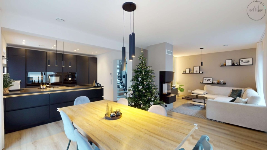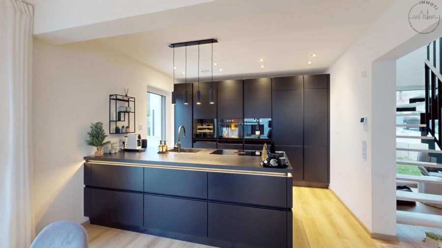 Die hochwertige Nolte-Einbauküche fügt sich perfekt in das moderne Wohnkonzept ein und ist mit einem Bora-Kochfeldabzug, Weinkühlschrank, Quooker-Wasserhahn sowie integrierten Markengeräten ausgestattet – funktional, stilvoll und ideal für den Alltag wie auch für Gäste.