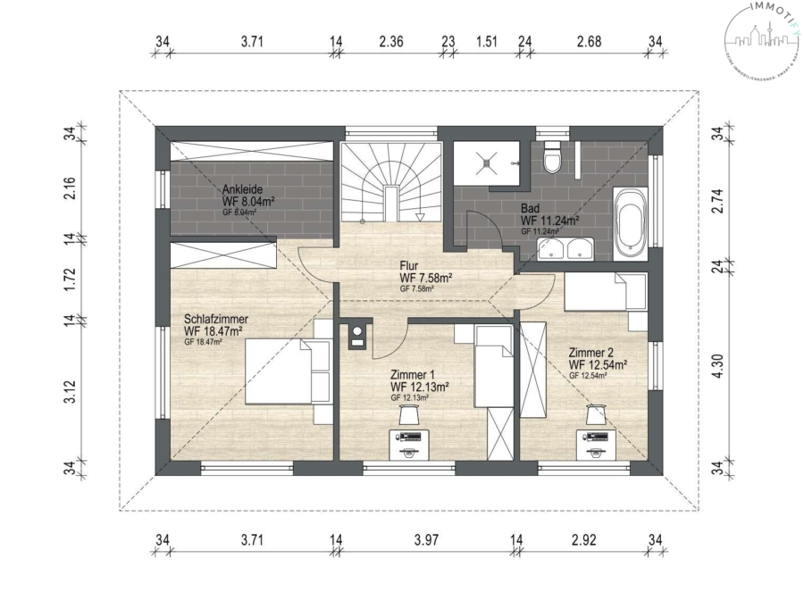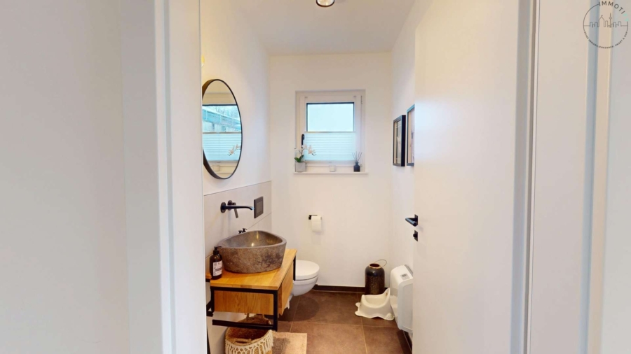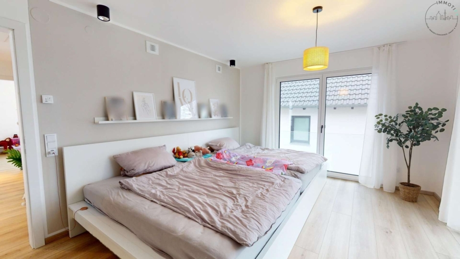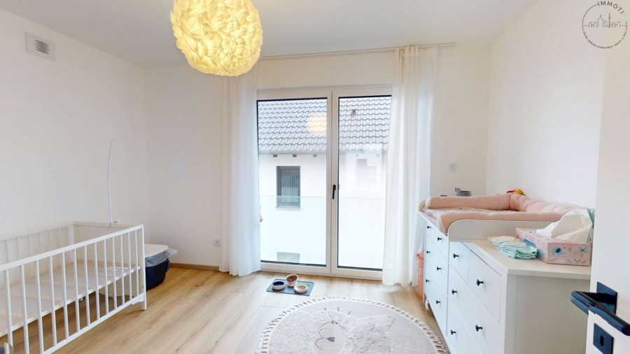 Im Obergeschoss erwarten Sie ein großzügiges Schlafzimmer mit angrenzendem Ankleidebereich, zwei helle Kinderzimmer sowie ein hochwertig ausgestattetes Tageslichtbad. Dieses überzeugt mit bodentiefem Fenster, freistehender Badewanne, Doppelwaschbecken und maßgefertigten Schreiner-Unterschränken – modern, elegant und durchdacht bis ins Detail.