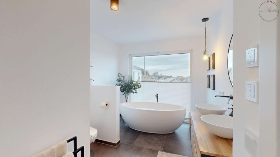 - Tageslichtbad mit bodentiefem Fenster, freistehender Wanne und Doppelwaschbecken