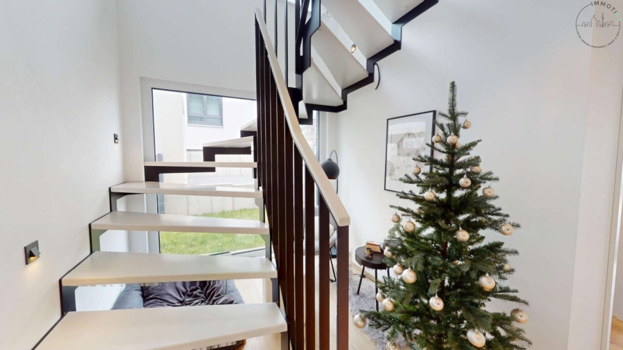 Ein besonderes Highlight ist das offen gestaltete Treppenhaus: Zwei große, bodentiefe Fenster, die sich vom Boden bis zur Decke erstrecken, fluten den gesamten Bereich mit Tageslicht und verleihen dem Haus bereits beim Betreten eine außergewöhnlich offene und hochwertige Atmosphäre.