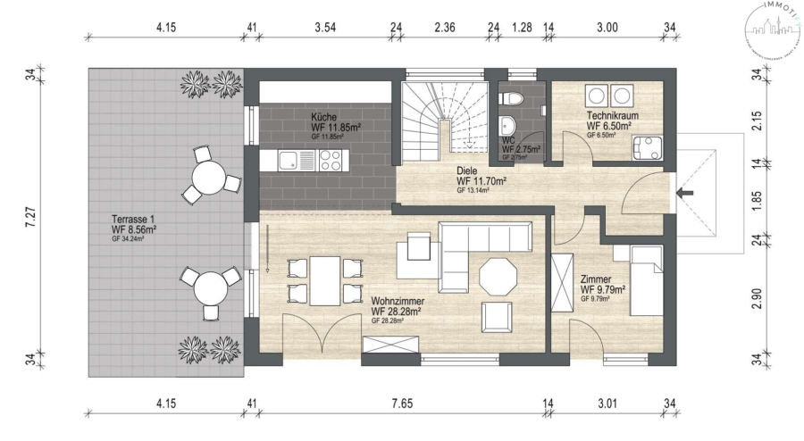 Ein Gästezimmer, das Gäste-WC sowie der Technikraum runden das Erdgeschoss ab.