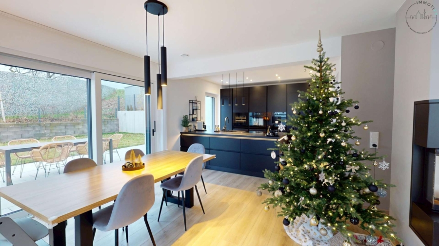Herzstück der Immobilie ist der offen gestaltete Wohn-, Ess- und Kochbereich. Großzügige, bodentiefe Fensterflächen schaffen eine helle und freundliche Atmosphäre und ermöglichen den ebenerdigen Zugang zur Terrasse und in den Garten. Ein integrierter Kaminofen sorgt zusätzlich für Behaglichkeit und macht den Wohnbereich ganzjährig zu einem besonderen Rückzugsort.