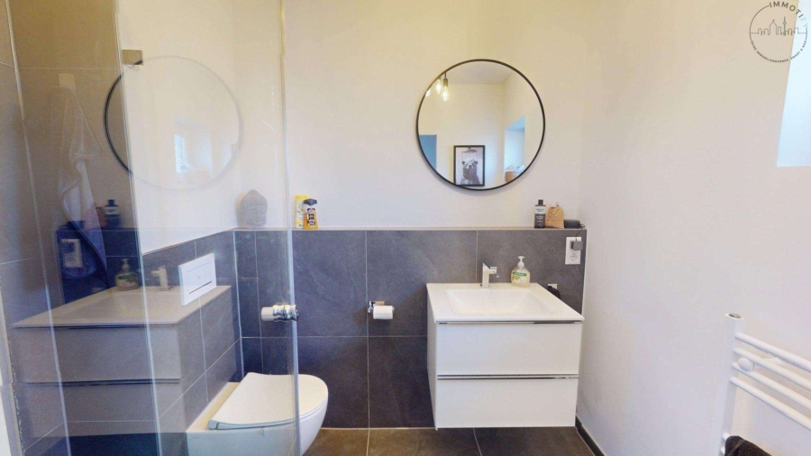 Im Obergeschoss stehen zwei vielseitig nutzbare Zimmer zur Verfügung, ideal als Schlaf-, Gäste- oder Kinderzimmer. Das großzügige Tageslichtbad wurde ebenfalls vollständig saniert und verfügt über eine bodengleiche Dusche sowie ein WC – modern, zeitlos und komfortabel.