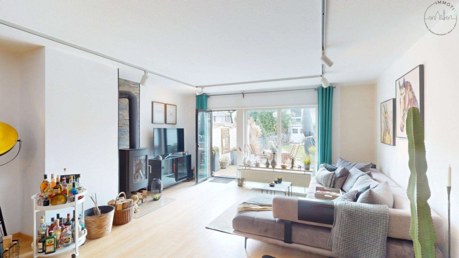 Das Erdgeschoss bildet das kommunikative Herz des Hauses. Der großzügige Wohn- und Essbereich öffnet sich über bodentiefe Fensterflächen zum liebevoll angelegten Garten mit Terrasse in Südausrichtung. Hier entsteht eine harmonische Verbindung zwischen Innen- und Außenraum – perfekt für entspannte Stunden mit Familie und Freunden.