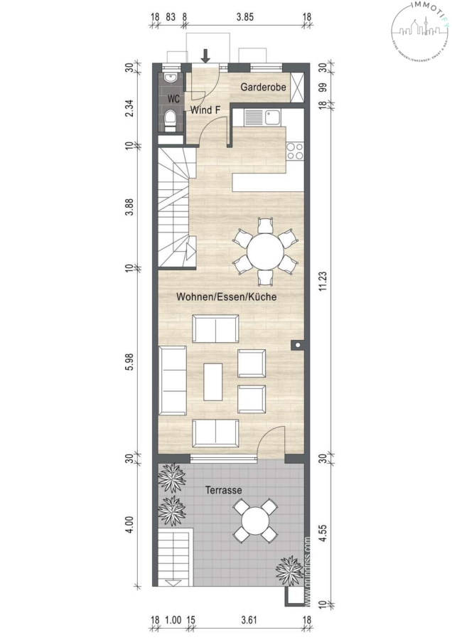 Wohnen / Essen mit offener Küche, Gäste-WC, Garderobenbereich, Garten, Terrasse