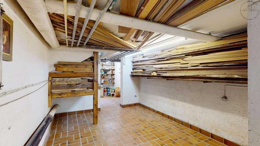 Das Kellergeschoss beherbergt einen großen Hobbyraum mit einem stillgelegten Pool und einer Bar, zwei Lagerräume sowie eine großzügige Werkstatt mit reichlich Stauraum.