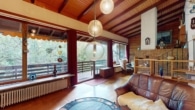 Eine halbe Etage tiefer lädt der gemütliche Wohnbereich mit Zugang zum großen, überdachten Balkon zum Entspannen ein. Lassen Sie den Alltag hinter sich und genießen Sie die grüne Umgebung in vollen Zügen. Weiterhin finden Sie auf dieser Ebene ein abgeschirmtes Kaminzimmer und ein Arbeitszimmer.