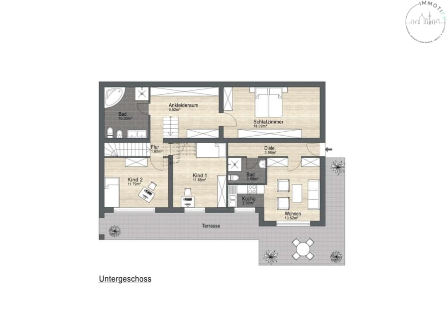 Auf gleicher Ebene (UG 2) liegt dann auch eine großzügige Einliegerwohnung mit eigenem, separaten Zugang. Sie besteht aus einem Wohnzimmer mit offener Küche, einem Schlafzimmer, einem Badezimmer und einer privaten Terrasse.