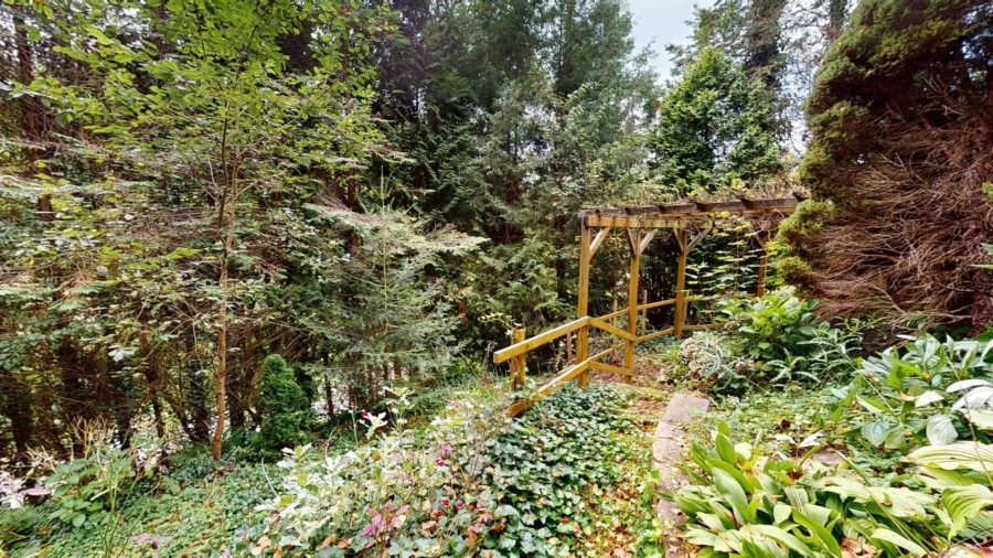 Der Außenbereich des Grundstücks besticht durch zwei Terrassen und einen beeindruckenden Baumbestand, der die Nähe zum Wald unterstreicht und für eine ruhige, abgeschiedene Atmosphäre sorgt.