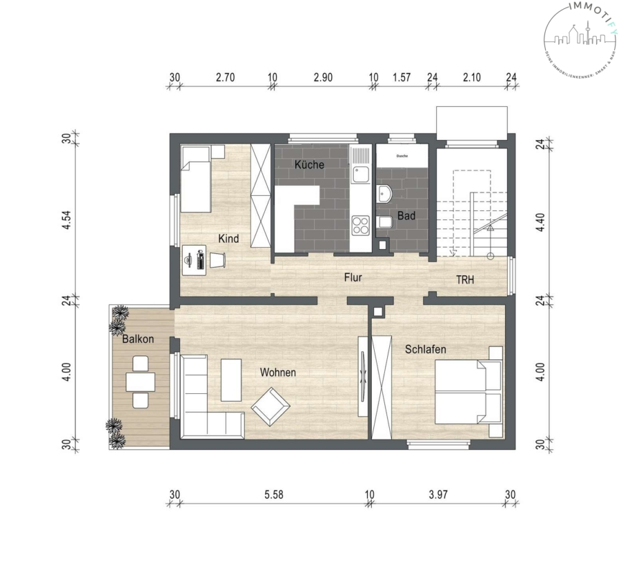 Auch die Obergeschosswohnung präsentiert sich als vollwertige, in sich geschlossene Einheit mit drei Zimmern, Küche, Balkon mit Blick auf den Garten und einem hellen Tageslichtbad. Die Raumaufteilung ermöglicht flexibles Wohnen und lässt sich individuell gestalten – ob als Familienwohnung, zur Eigennutzung oder zur Vermietung.