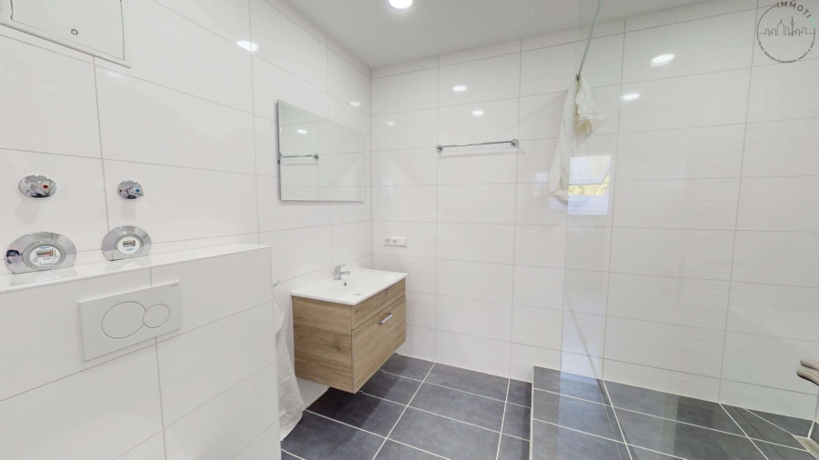 Großflächiges Wohnzimmer, helle Essdiele mit Einbauküche, gemütliches Schlafzimmer, neues Bad mit offener Dusche