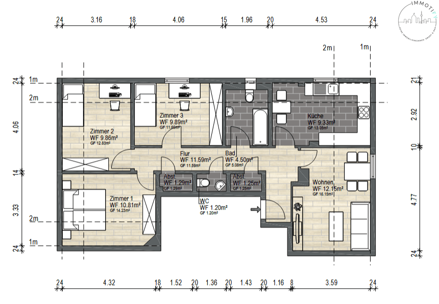 Die Wohnung verfügt über vier separat nutzbare Schlafzimmer, die sich ideal zur Einzelvermietung eignen. Ergänzt wird das Konzept durch eine großzügige Gemeinschaftsküche, die ausreichend Platz für einen zusätzlichen Essbereich bietet – ein klarer Pluspunkt für studentische Wohngemeinschaften.