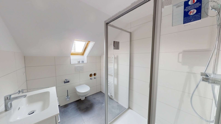Das Tageslichtbadezimmer wurde ebenfalls vollständig saniert und ist mit Dusche, WC und Waschtisch ausgestattet.