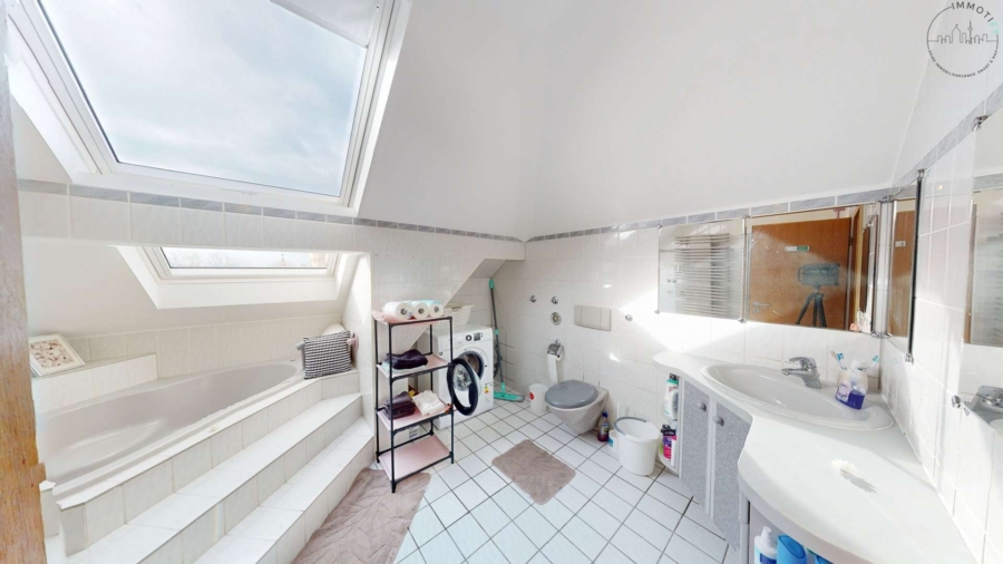 - Badezimmer mit Eckbadewanne inkl. Whirlpool-Funktion, Dusche, WC, Waschmaschinenanschluss, Fenster und Waschtisch