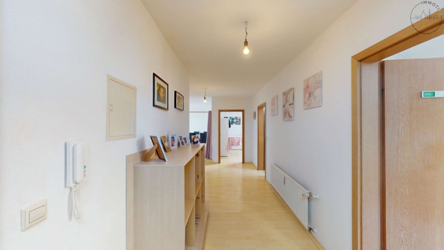 Über einen langen Flur gelangen Sie direkt in das offen gestaltete, leicht erhöhte Wohnzimmer, das den Mittelpunkt der Wohnung bildet.