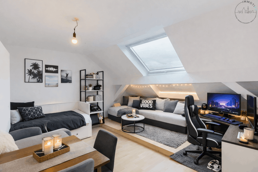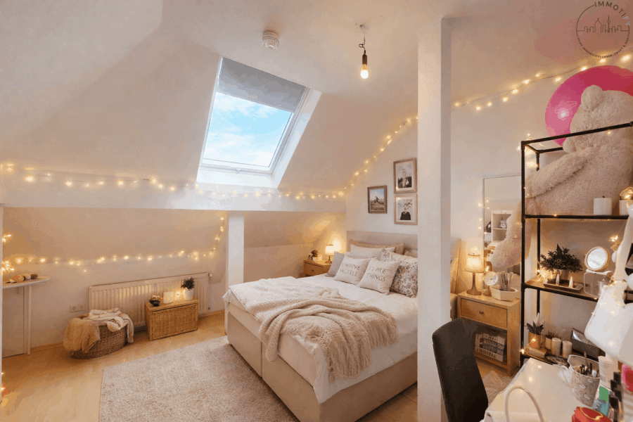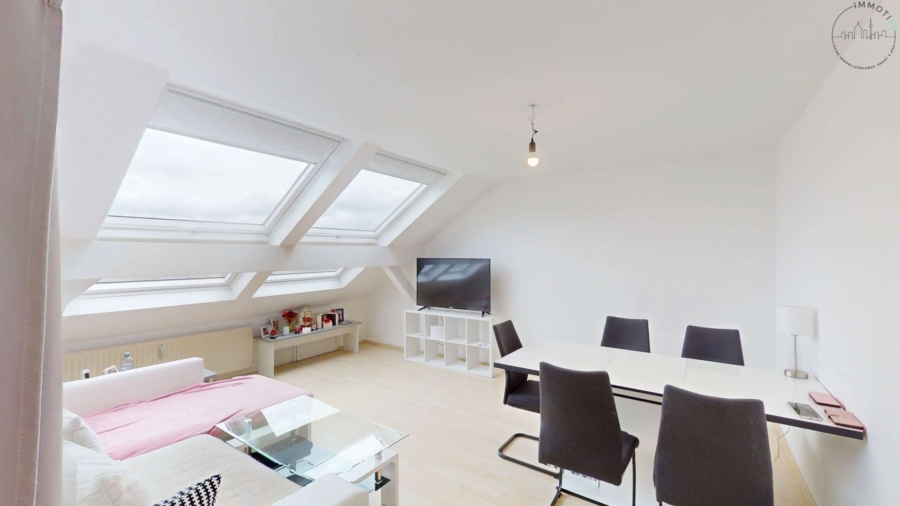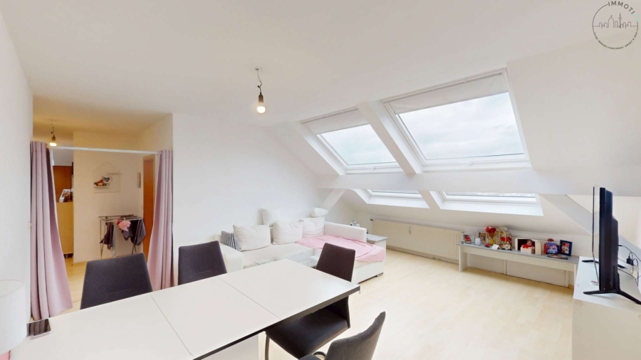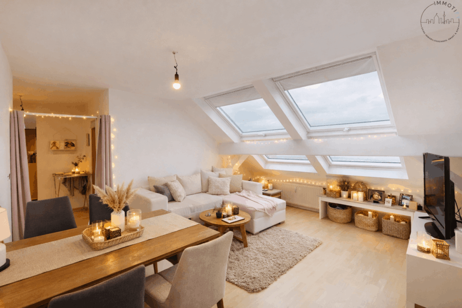 Im Inneren überzeugt die großzügige 4-Zimmer-Wohnung auf 99m² durch ihre offene Raumwirkung und vor allem durch ihre außergewöhnliche Belichtung: Insgesamt 18 Dachfenster sorgen den ganzen Tag über für eine helle, freundliche Atmosphäre und ein einzigartiges Wohngefühl.