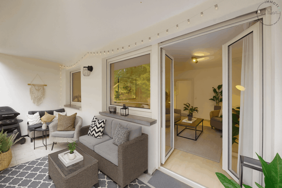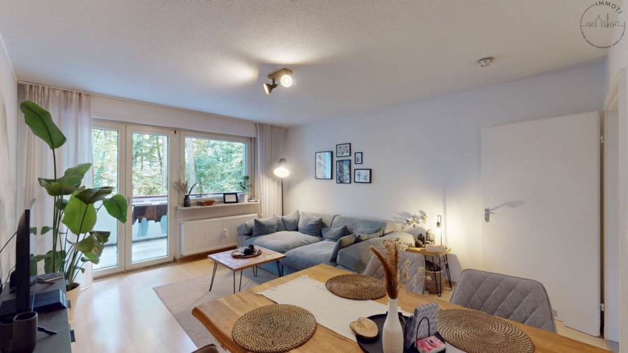Das Herzstück der Wohnung bildet das große Wohnzimmer mit Zugang auf den überdachten Hauptbalkon. Dank der idealen Ausrichtung nach Osten genießen Sie hier angenehme Stunden – perfekt für den ersten Kaffee am Morgen.