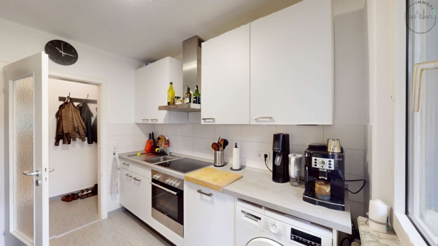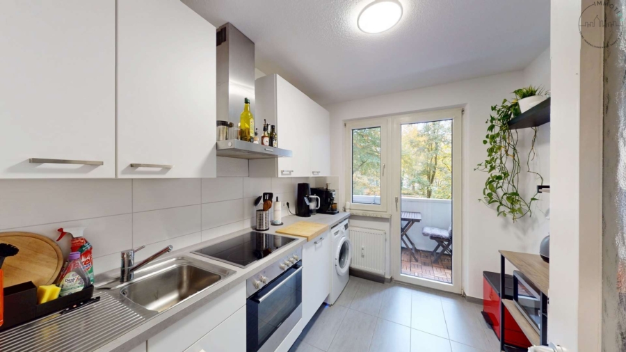Die geräumige Wohnküche ist hell gestaltet und bietet Platz für einen Essbereich. Sie verfügt ebenfalls über einen Zugang auf den kleineren Balkon, der sich wunderbar als kleine Sitzecke eignet.
