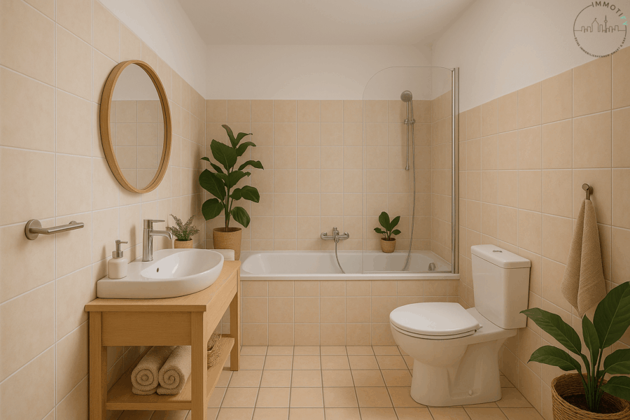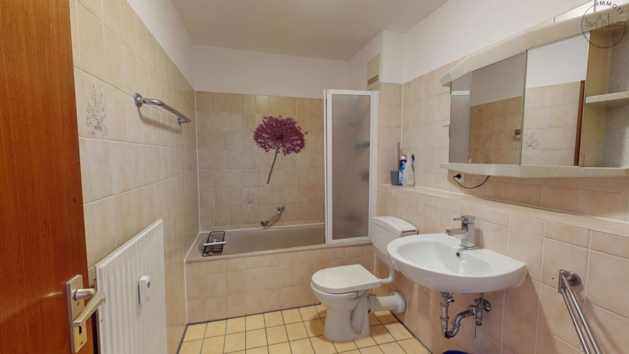 - Badezimmer mit Badewanne, WC und Waschmaschinenanschluss