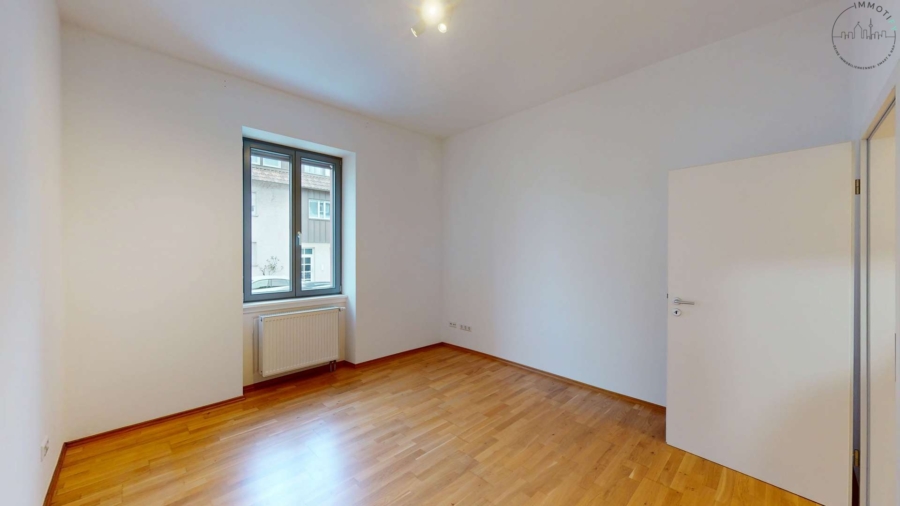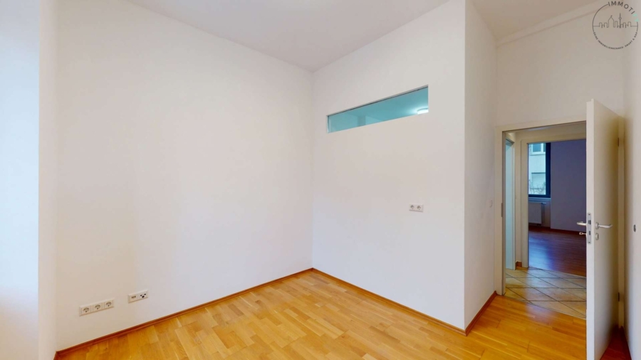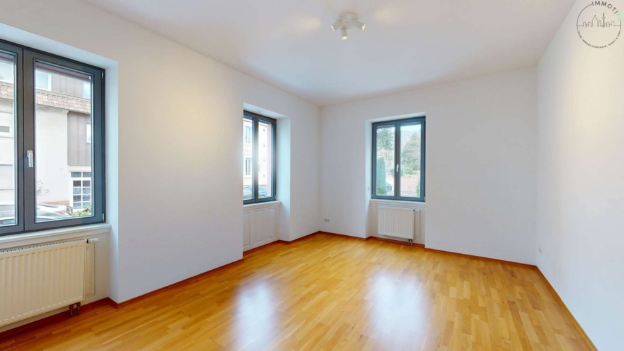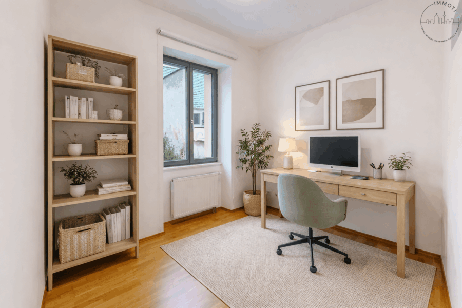 Die Wohnfläche verteilt sich auf ein großes, helles Wohnzimmer, ein Schlafzimmer, ein separates Büro- oder Gästezimmer sowie eine großzügige Küche mit Essbereich und direktem Zugang zum Balkon. Der Balkon erweitert den Wohnraum angenehm und bietet einen schönen Platz für entspannte Stunden im Freien – mitten in der Stadt und dennoch ruhig gelegen.