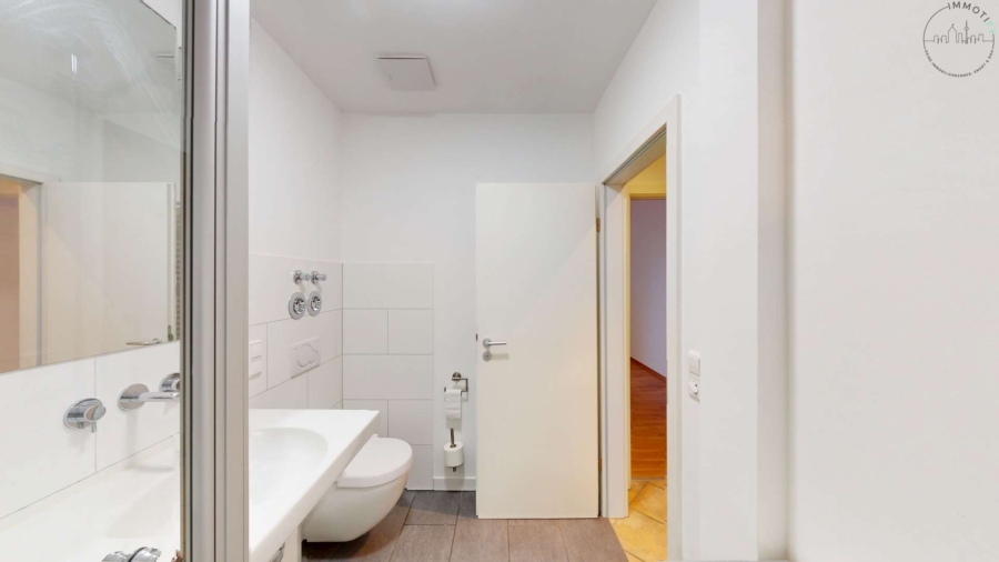 Das Badezimmer ist modern ausgestattet mit Dusche, WC und Waschtisch. Ein besonderes Detail ist das Oberlicht, das für zusätzliches Tageslicht sorgt und dem innenliegenden Bad eine angenehme, helle Atmosphäre verleiht.