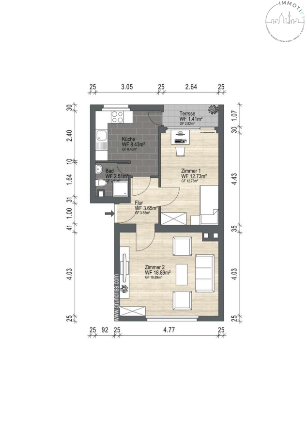 Laut Unterlagen beträgt die Wohnfläche 44,33 m².