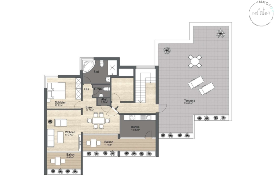 - Spektakuläre Dachterrasse (ca. 75 m²) mit Sondernutzungsrecht – exklusiv für den Eigentümer
