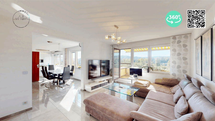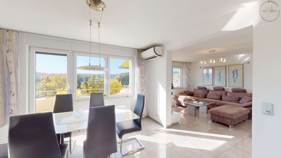 Das Herzstück der Wohnung bildet der helle Wohn- und Essbereich mit Zugang zu zwei Balkonen.