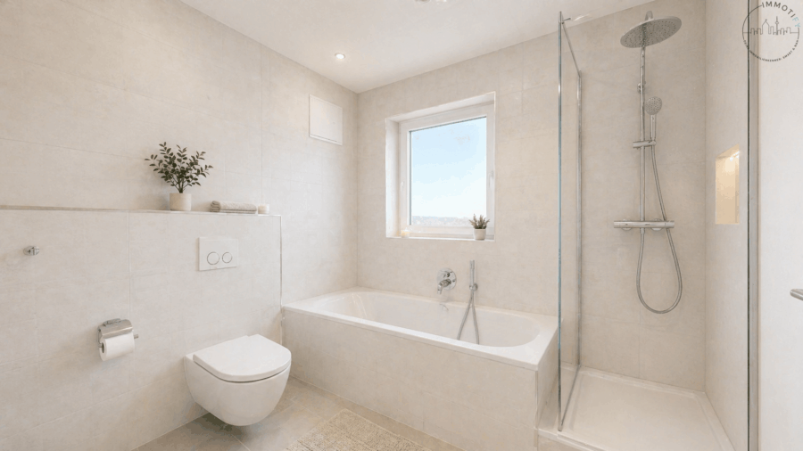 - Badezimmer mit Fenster, Dusche und Badewanne