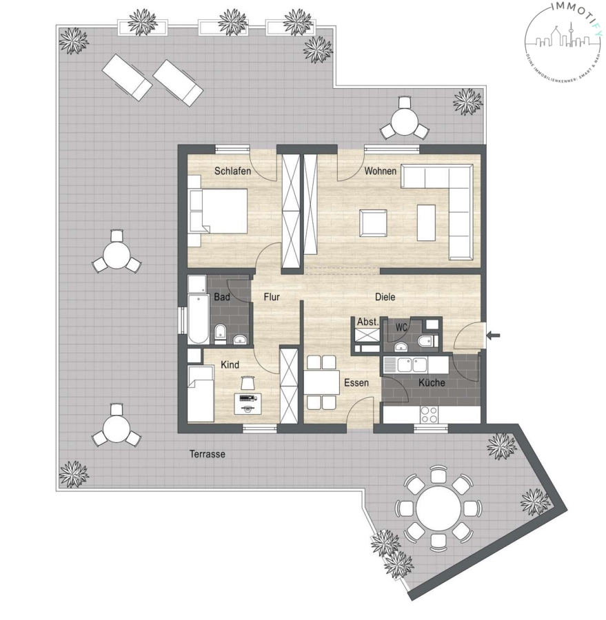 - Großzügige Dachterrasse mit Zugang vom Wohnbereich, Essbereich, Schlafzimmer und weiterem Zimmer