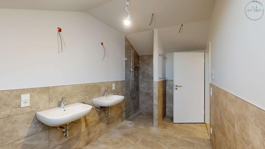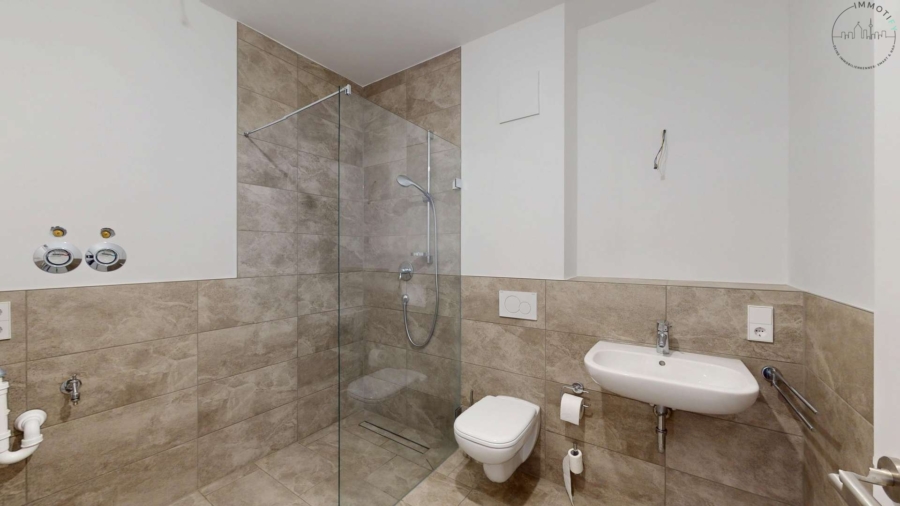 - Badezimmer mit Dusche, WC und Waschmaschinenanschluss
