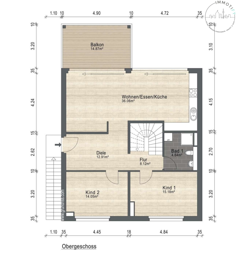 Im ersten Obergeschoss befinden sich außerdem ein großzügiger Dielenbereich, zwei helle Schlafzimmer sowie ein modernes Badezimmer mit Dusche, WC und praktischem Waschmaschinenanschluss.