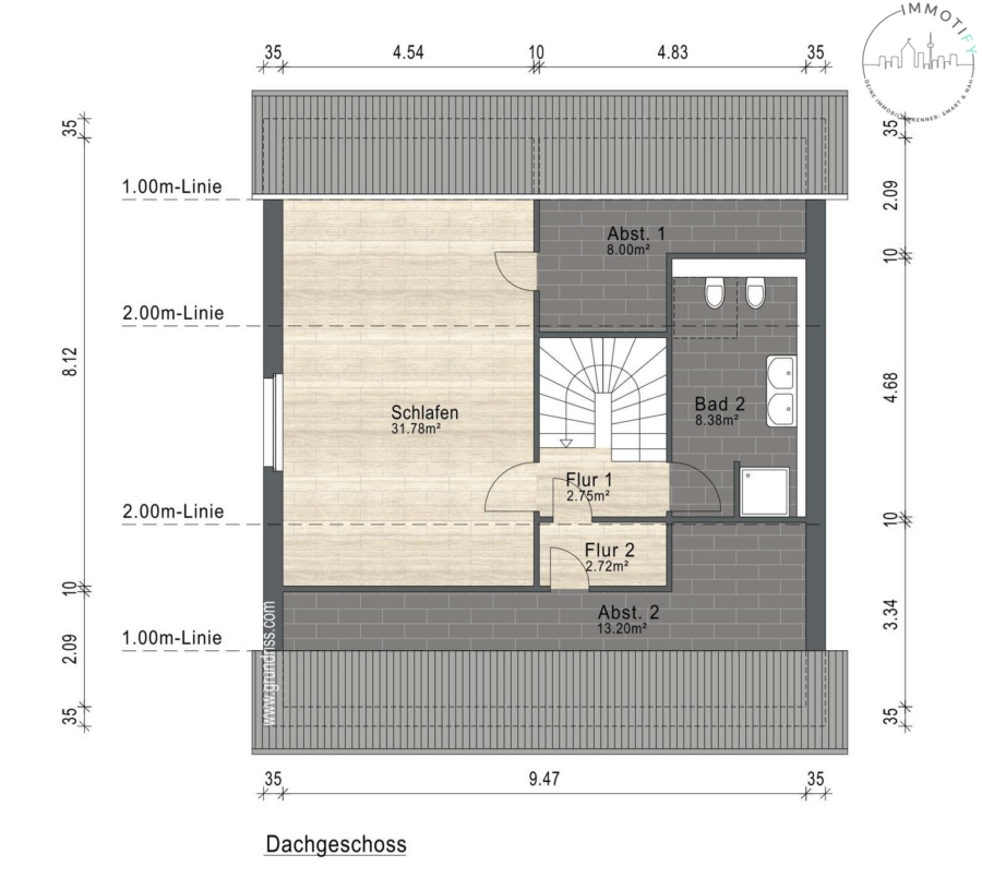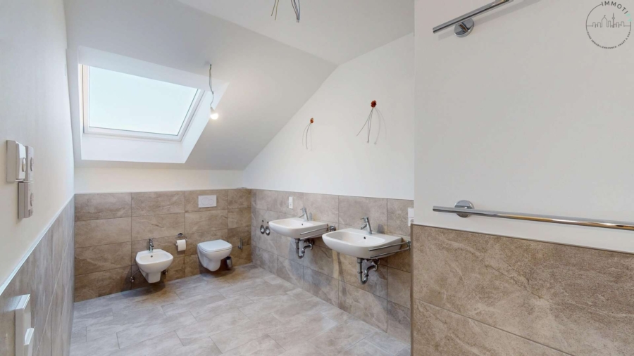Das Dachgeschoss bietet zusätzlichen Komfort: Hier befindet sich ein weiteres klimatisiertes Schlafzimmer (bzw. Studiozimmer) mit angrenzender Abstellkammer und viel Stauraum im Kniestock. Ein zweites, sehr großes Tageslichtbad mit Dusche, WC, Bidet und Waschbecken rundet das Raumangebot ab.